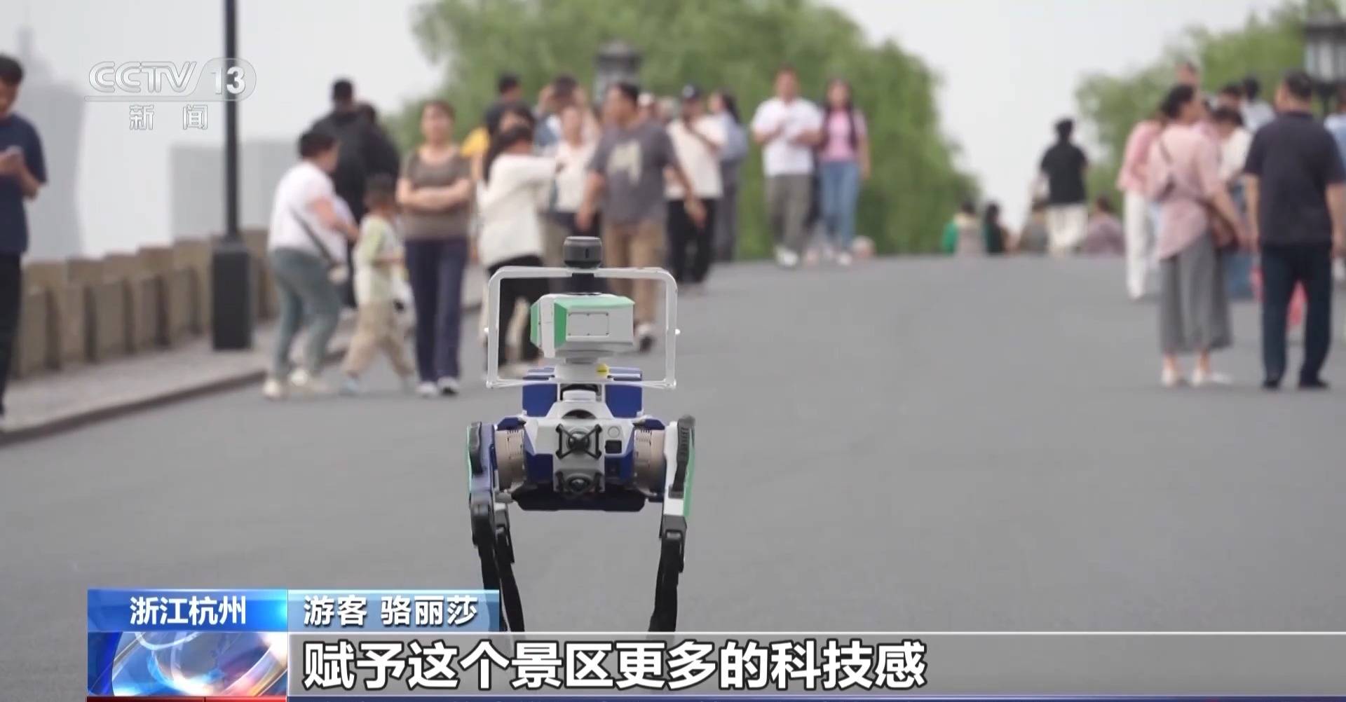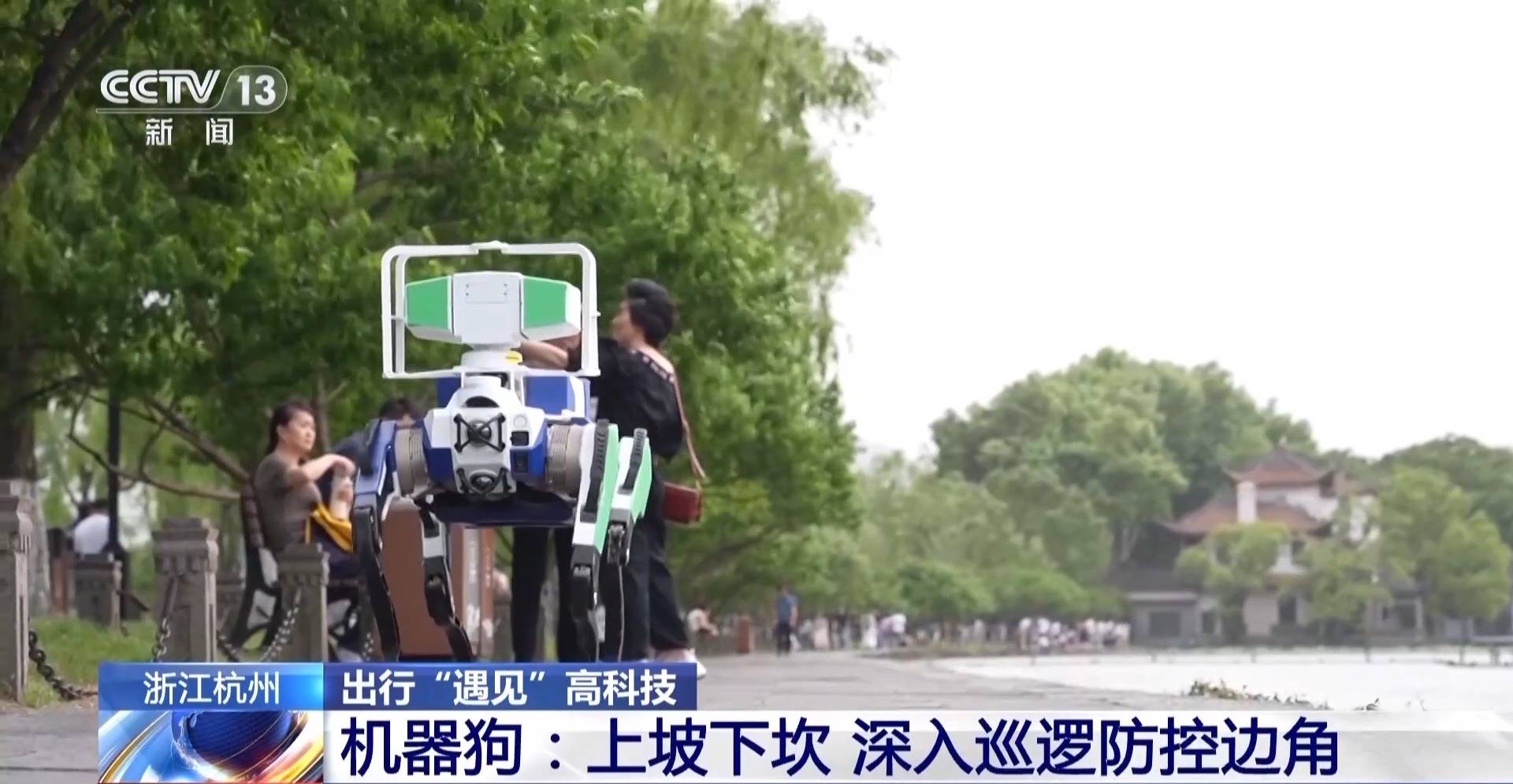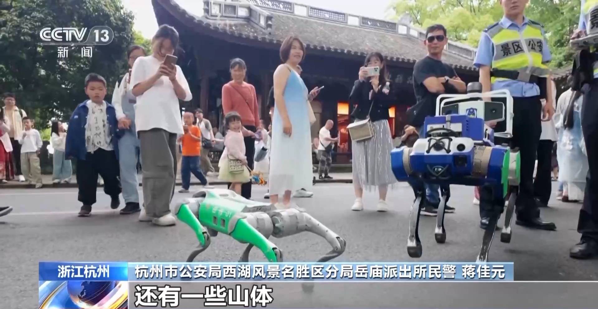 杭州市公安局西湖风景名胜区分局岳庙派出所民警蒋佳元:我们景区的车巡主要是主干道上进行,景区里还有很多游客走的游步道,还有一些山体,人巡山体比较危险,所以我们引入了四足机器人,确保景区的巡逻防控到边到角。